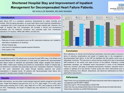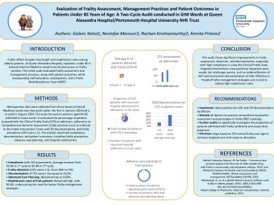 Title: Evaluation of Frailty Assessment, Management Practices, and Patient Outcomes in GIM Patients Under 85 Years: A Two-Cycle Audit in GIM Wards at Queen Alexandra Hospital, Portsmouth Hospital University NHS trust. Introduction: Frailty significantly affects outcomes like length of stay and readmissions in elderly patients. At Queen Alexandra Hospital, inpatients under 85 are under the care of General Internal Medicine (GIM) wards and they lack regular access to frailty services. This baseline audit evaluated frailty assessment, management practices and patient outcomes, implementing staff
