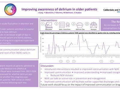 Delirium is a neuropsychiatric syndrome characterised by an acute fluctuation in attention and cognition and affects approximately one quarter of older patients admitted to hospital (1) (2). Delirium results in increased length of stay, increased risk of long-term cognitive impairment, increased mortality, and results in significant patient and carer distress (3) (4) (5). Electronic patient records for adults admitted to the Frailty Acute Medical Unit (fAMU) at Huddersfield Royal Infirmary from 2022 to 2024 were reviewed to assess whether delirium was identified, and whether this was discussed