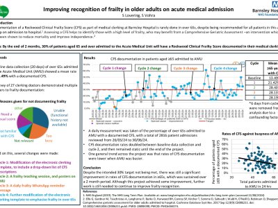 Background Frailty in over 65s is common, but is not often assessed on medical admission at Barnsley Hospital. Identifying frail patients is clinically important, as it can highlight those who may benefit from a Comprehensive Geriatric Assessment –an intervention which has been shown to reduce mortality and improve independence. Introduction At Barnsley Hospital, only 13.49% of patients aged over 65 admitted to the Acute Medical Unit (AMU) were found to have a documented Rockwood Clinical Frailty Score (CFS). This project aimed to increase this to a target of 30%. Methods A survey conducted