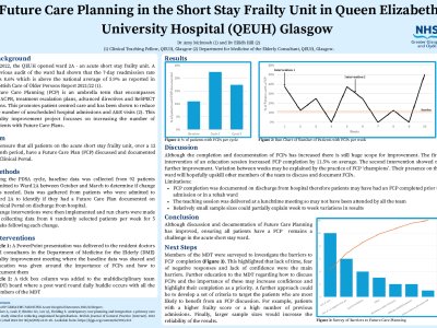 Background: In 2022, the QEUH opened an acute short stay frailty unit. Previous QI projects had shown that the 7-day readmission rate was above the national average. Implementing future care plans was thought to be a way of reducing unnecessary readmissions to hospital. Aim: To ensure that all patients on the acute short stay frailty unit, over a 12 month period, have a Future Care Plan (FCP) discussed and documented on Clinical Portal Methods: Using the PDSA cycle, baseline data was collected from 92 patients admitted to Ward 2A between October and March to determine if change was needed