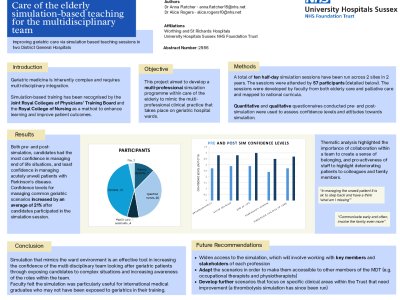 Introduction Geriatric medicine is inherently complex and requires multidisciplinary integration. Simulation-based training is recognised as a method to enhance learning and improve patient outcomes. This project aimed to develop a multi-professional simulation programme within care of the elderly to mimic the multi-professional practice of geriatrics. Methods Ten half-day simulation sessions were run across two sites over two years. The scenarios cover frailty, orthogeriatrics, acute delirium, Parkinson’s disease, thrombolysis and palliative care. There were 57 participants, including 24