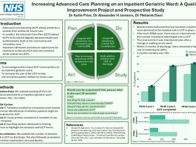 Background Advanced care planning (ACP) allows patients to discuss their wishes for future care. In London, the Universal Care Plan (UCP) allows ACPs to be shared digitally between healthcare professionals in the community and secondary care. Inpatient admission provides an opportunity for ACP discussions, and documentation via a UCP on discharge. Methods We audited pre-existing UCPs in all patients admitted to an inpatient geriatric ward between May and October 2024. We then conducted 3 PDSA cycles to promote ACP discussions during admission, and documentation via new or updated UCPs. - PDSA