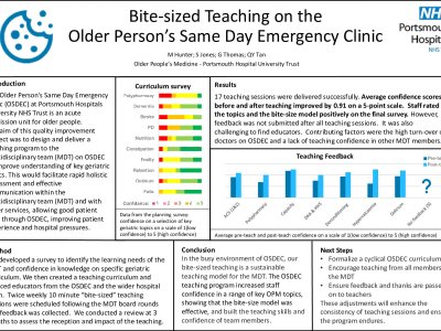 Category one – clinical effectiveness Category two- Innovation Background The Older Person’s Same Day Emergency Clinic (OSDEC) at Portsmouth Hospitals University NHS Trust is an acute admission unit for older people. Introduction The aim of this quality improvement project was to design and deliver a teaching programme to improve understanding of key OPM topics and the complexity of older patients on OSDEC. This would facilitate rapid holistic assessment and effective communication within the multidisciplinary team (MDT) and with other services, improving patient flow through OSDEC, which