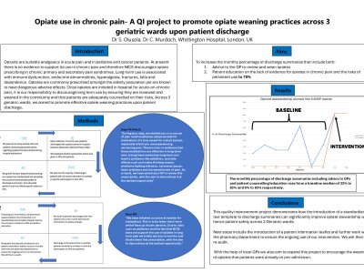 Introduction: Opiates are suitable analgesics in acute pain. However, there is no evidence to support their use in chronic pain and NICE discourages its prescription. Opiates are commonly prescribed amongst the elderly, and long-term use is associated with immunosuppression, hyperalgesia, fractures, falls and dependence. Once opiates are prescribed for acute-on-chronic pain, we should discourage long-term use by ensuring they are reviewed and weaned in the community and that patients are counselled on their risks. We aimed to promote effective opiate weaning practices upon patient discharge