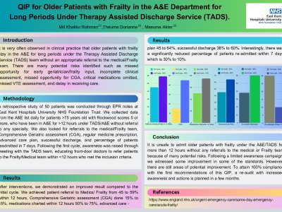 Introduction: It is very often observed in clinical practice that older patients with frailty stay in the A&E for long periods under the Therapy Assisted Discharge Service (TADS) team without an appropriate referral to the medical/Frailty team. There are many potential risks identified such as missed opportunity for early geriatrician/frailty input, incomplete clinical assessment, missed opportunity for CGA, critical medications omitted, missed VTE assessment, and delay in receiving care. Methodology: A retrospective study of 50 patients was conducted through EPR notes at East Kent Hospitals