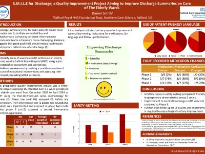 Introduction: Discharge summaries (DS) for older patients can be more complex due to an increasing life-expectancy and multiple co-morbidities. However, this is not always reflected in the quality of DS produced. It is generally agreed that good quality DS should reduce readmission and improve patient care after discharge. Aims: Identify areas of weakness in Discharge summary V4 a on an elderly care ward at Salford Royal Hospital (SRFT) using a pre-established assessment and scoring tool. Secondary aims were to use interventions an educational session, poster (S.M.I.L.E) and acronym expansions