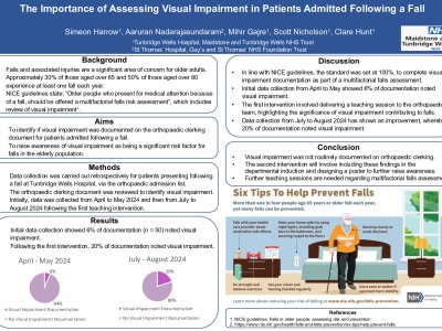 Background: - Falls and associated injuries are a significant area of concern for older adults. Approximately 30% of those aged over 65 and 50% of those aged over 80 experience at least one fall each year. - NICE guidelines state, “Older people who present for medical attention because of a fall, should be offered a multifactorial falls risk assessment”, which includes review of visual impairment. Aims: - To identify if visual impairment was documented on the orthopaedic clerking document for patients admitted following fall. - To raise awareness of visual impairment as being a significant