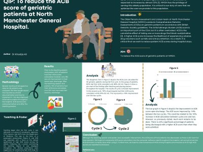 Introduction The Older Persons Assessment and Liaison team at North Manchester General Hospital (NMGH) reviews geriatric patients using a Comprehensive Geriatric Assessment (CGA), as directed by the British Geriatric Society. The Anticholinergic Burden (ACB) score is an integral part of the CGA however it is often overlooked. ACB is the cumulative effect of taking one or more drugs used to block Acetylcholine. A greater ACB score increases the risk of developing adverse drug reactions such as; falls and urinary retention. As such, it is integral that we work to reduce patient ACB scores during