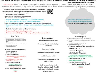 The elderly population ( cut off 65 and over, for this audit) are being increasingly prescribed direct oral anticoagulants(DOAC) for prevention of stroke in atrial fibrillation/ prevention and treatment of DVT/PE.This poses significant difficulties when stopping/ restarting these medications in the peri-operative period , due to the ever changing clinical circumstances in this period. Therefore , we performed an audit( in Glangwili Hospital, Jan-July 2024) , using the Welsh Frailty Fracture Network guidelines as our standard and found out(during the first cycle) that around 40 percent of