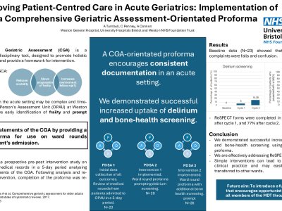 Background: The Comprehensive Geriatric Assessment (CGA) is a multidimensional interdisciplinary tool, designed to promote holistic care of elderly patients and provide a framework for intervention. There is evidence that the CGA reduces mortality and slows progression of frailty. Performing such interventions in the acute setting can be complex and time-consuming. Introduction: The Older Person’s Assessment Unit (OPAU) at Weston General Hospital allows early identification of frailty and prompt intervention. We aimed to promote elements of the CGA by providing a tool for utilisation