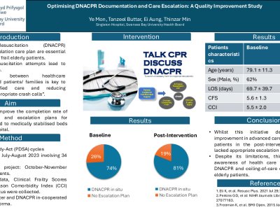 Introduction: Do Not Attempt Cardiopulmonary Resuscitation (DNACPR) decision and plan for escalation of care are essential components of holistic care for frail and elderly patients. Inappropriate resuscitation attempts in those populations lead to distress and harm. Improving communication about end-of-life care plan between healthcare professionals and patients/ families is key to delivering dignified care and reducing emergency “inappropriate crash calls”. Aim: The aim of this project was to assess and improve the completion rate of DNACPR forms and care escalation plans for patients