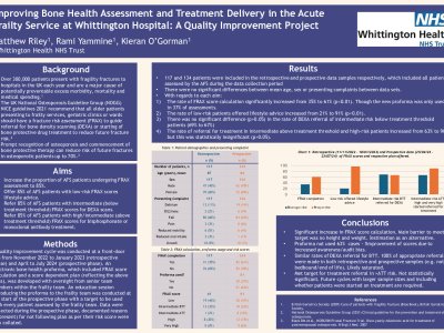 Background: The UK National Osteoporosis Guideline Group (NOGG) guidelines 2021 recommend that all older patients presenting to geriatric clinics or wards should have a FRAX assessment guide BMD measurement and referral for DEXA or starting of drug treatment. Aims: 1) To increase the proportion of patients assessed by the acute frailty service (AFS) undergoing FRAX assessment to 85%. 2) Offer 85% of AFS patients with low-risk FRAX scores lifestyle advice. 3) Refer 85% of AFS patients with intermediate (below treatment threshold) FRAX scores for DEXA scans. 4) Refer 85% of AFS patients with
