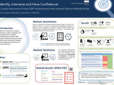 Introduction: Delirium is common in hospital inpatients, under-recognised, and associated with increased morbidity and mortality. NICE quality standards are that all at-risk adults newly admitted to hospital receive tailored interventions to prevent delirium. Aims: 1. To reduce time to diagnosis of delirium. 2. For 100% of patients with delirium to have tailored interventions, including behaviour/ bowel/ food charts, medication reviews, and family involvement. 3. To increase junior doctors’ confidence in recognising and managing delirium. Methods: Two changes were implemented and three cycles