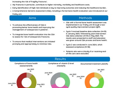 Background: Zoledronic acid (Zol) is used in the prevention and treatment of osteoporotic fractures. Once IV Zol has been administered as an inpatient, discharge documentation and GP communication should be completed. However, this can be inconsistent and can compromise continuity of care. A checklist produced by the HCOP (Health Care of Older People) team aimed to standardise osteoporosis management. In addition to the metrics reviewed in the previous 4 audit cycles, this audit looked at vitamin D correction before Zol. Methods: Data was collected from 55 patients receiving their first dose