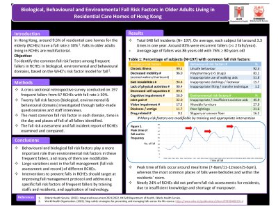 Introduction The fall risk factors in older adults living in residential care homes for the elderly (RCHEs) are multifactorial. In Hong Kong, around 9.5% of RCHEs have a fall rate over 30% (Elderly Health Service, 2022)1. The objective of this survey is to identify the common fall risk factors among frequent fallers in RCHEs in biological, environmental, and behavioural domains, based on the World Health Organization (WHO)’s risk factor model for fall (World Health Organization, 2021)2. Methods 197 frequent fallers from 67 RCHEs with fall prevalence over 30% in Hong Kong were included in this