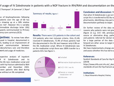 Background: Use of bisphosphonates following NOF fracture in patients over the age of 60 has extensive evidence showing up at a 50% relative reduction in fracture risk. However this is variably recorded on the immediate discharge letter (IDL) and subsequently poorly communicated to Primary Care via the emergency care summary (ECS). Aim: To review how often IV Zoledronate is used in hospital, documented in the IDL and on ECS, leading to an improvement of documentation and communication between primary and secondary/tertiary care and therefore the safer management and usage of medicines. Method