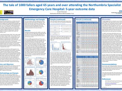 Introduction: This audit was performed by the Northumbria-Healthcare NHS Foundation Trust (NHFCT) Falls and Syncope Service to inform the development of the NHFCT Integrated Falls Strategy (IFS). Method: From the opening of the Northumbria Specialist Emergency Care Hospital (NSECH) on 16/06/2015 all ED records were prospectively screened to identify the first 1000 patients aged 65 years and over that had attended with a fall. The 5-year outcome data was obtained from NHFCT electronic records. Results: Of the 1000 attends aged 65 years and over with a fall (13.7 attends daily), 55 were patients