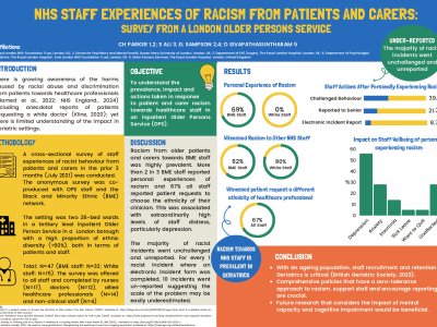 Introduction: There is growing awareness of the harms caused by racial abuse and discrimination from patients towards healthcare professionals, including anecdotal reports of patients ‘requesting a white doctor’ (Kline, BMJ Opinion, 2020); yet there is limited understanding of the impact in Geriatric settings. We conducted a survey in an inpatient Older Persons Service (OPS) on the prevalence, impact and actions taken in response to patient racism towards staff. Methods: A cross-sectional survey (Total N=47; Black and Minority Ethnic (BME) staff: N=32; White staff: N=15) of staff experiences