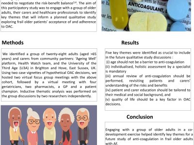 Introduction Despite the knowledge that oral anti-coagulation (OAC) is effective in secondary prevention of stroke, prescribing rates are low in frail older patients with atrial fibrillation (AF), dementia, and high fall risks. A joint decision-making approach between clinicians, patients and carers is needed to negotiate the risk-benefit balance. The aim of this participatory study was to engage with a group of older adults, their carers and healthcare professionals to identify key themes that will inform a planned qualitative study exploring frail older patients’ acceptance of and adherence