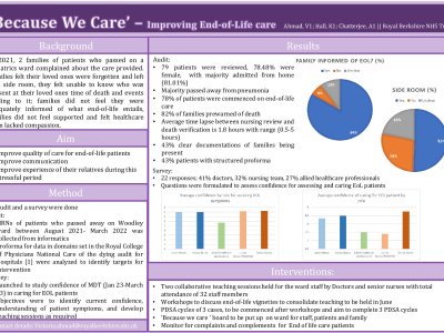 Introduction Improvement project in response to several bereavement meetings with families reporting concerns with communication and care received during their loved ones’ end of life care (EOLC). Methods Retrospective review of 79 inpatients documentation who died between August 2021-March 2022 in comparison against the Royal College of Physicians National Care of the dying audit to identify targets for intervention. Survey of 22 members of ward staff between (January-March 23) including medical, nursing, and allied health professionals to understand confidence, clinical knowledge and
