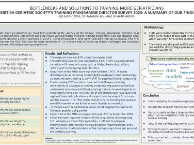Introduction: As we strive to generate more geriatricians we must understand the journey of the training programme. Whilst information is available from the RCP census and BGS workforce survey this study will compliment that data and obtain a broader picture. A similar survey was last undertaken by the BGS in 2019 and since that time much has changed, from a pandemic to the first published NHS Long term workforce plan. Method: TPDs were contacted directly by the BGS VP for workforce at the geriatric medicine specialty advisory committee and invited to complete an electronic survey. The survey