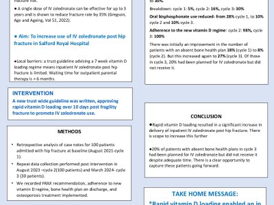 Background: Patients who experience a hip fracture have a high re-fracture risk. Prompt initiation of anti-osteoporosis treatment is therefore vital. Oral bisphosphonates are less well tolerated in some older people resulting in poor adherence. A single dose of IV zoledronate however, can be effective for up to 3 years and is shown to reduce fracture rate by 35% (Gregson, Age and Ageing, Vol 51, 2022). Aim: To increase use of IV zoledronate post hip fracture in Salford Royal Hospital Local barriers: a trust guideline advising a 7 week vitamin D loading regime means inpatient IV zoledronate