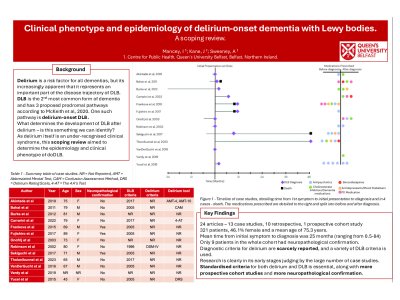 Introduction Dementia with Lewy bodies (DLB) is the second most common form of dementia, however it can be difficult to recognise and is often misdiagnosed. Many cognitive, motor and psychiatric symptoms occur in the prodromal phase of DLB, years before clinical diagnosis. Delirium-onset DLB is one of three purported prodromal pathways by which DLB develops (McKeith et al., 2020). As delirium itself is an under-recognised clinical syndrome, this scoping review aimed to determine the epidemiology and clinical phenotype of delirium-onset DLB. Methods Electronic databases MEDLINE (ALL), Embase