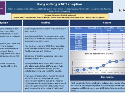 Introduction: Population is growing old worldwide and UK is no exception. Health service models designed to cater the needs of service users are under immense pressure due to the aging phenomenon. With unprecedented demand, their often low acuity, hence low priority and delayed conveyance to hospital and unavailability of services to address their needs due to delayed arrival; frail older patients often have to wait longer in emergency department (ED) to receive care in ED. Innovation and news models of care are therefore need of the hour to address this challenging situation. Methods: Quality