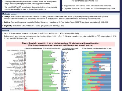 Introduction: Over one-third of older people with unplanned admissions to hospital are frail, but data on the burden of delirium, dementia and other cognitive frailty are lacking. Reliable hospital-wide and specialty-specific prevalence estimates are needed for service-planning including understanding the role of non-geriatricians in caring for this population. Methods: ORCHARD includes pseudo-anonymised EPR data for consecutive admissions with a length of stay of >1 day (2017-2019) to four hospitals in Oxfordshire (population=800,000). Data are collected using a standard cognitive screen