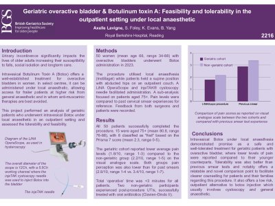 Introduction Urinary incontinence significantly impacts the lives of older adults increasing their susceptibility to falls, social isolation and longterm care Intravesical Botulinum Toxin A (Botox) offers a well-established treatment for overactive bladders in women. In select centres, it can be administered under local anaesthetic, allowing access for frailer patients at higher risk from general anaesthetic and in whom anti-muscarinic therapies are best avoided. This project performed an analysis of geriatric patients who underwent intravesical Botox under local anaesthetic in an outpatient