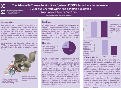 Introduction The ongoing rise in prostate cancer rates and consequent prostatectomy have led to an increase in rates of male stress urinary incontinence. ATOMS is an adjustable sling requiring no manual input and suitable for frailer patients. We investigated the long term efficacy of the ATOMs in managing SUI and performed a subanalysis within the geriatric population (aged 75+). Method 69 men (mean: 70.2, range 50-81) underwent an ATOMS insertion between 2015-2019. Follow up data for up to 9 years were analysed (mean: 5.8, range 5-9 years). Out of the 69 men in the original cohort, 19 were