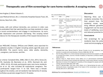 Introduction Symptoms of depression and anxiety, with and without dementia, are common in older care home residents. It is postulated that that watching films can help residents to share emotions, enhance social connectedness and engage in reminiscence. As such, films can ameliorate depression and promote well-being. This scoping review summarises the evidence for the therapeutic benefits of film-based interventions in care homes. Methods Electronic databases MEDLINE, Embase, EMCare and CINAHL were searched for quantitative and qualitative studies in English including adults aged 65 years and