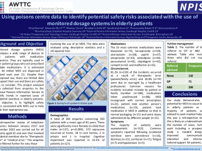 Introduction Monitored dosage systems (MDS) encompass a wide range of devices to help management of medication. This research uses poison centre data to explore risks associated with their use. Method A search of accidental overdose enquiries to the UK National Poisons Information Service (NPIS) between 1/01/2017-31/12/22, classified as “therapeutic error/medical error” involving patients aged 65 or over was performed. Enquiries involving an MDS were identified. Data were analysed using descriptive statistics and chi-square test. Results There were 394 enquiries concerning 393 patients and