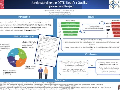 Introduction: The terminology surrounding manual-handling equipment and discharge planning is rarely taught in medical school. Yet, it is crucial for medical staff, particularly those working on Care of the Elderly (COTE) wards, to comprehend these terms to accurately assess a patient's function and optimise discharge planning. Methods: A 17-question survey was distributed to establish the baseline knowledge of medical staff in a district general hospital, with the aim of using PDSA (plan, do, study, act) cycles for improvement as needed. Following preliminary data analysis, a lunchtime
