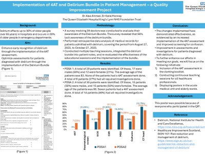Introduction: Delirium affects up to 50% of older individuals within hospital environments, with a notable occurrence in 30% of those aged 65 and above in emergency departments. This QIP aimed to enhance the early recognition of delirium by implementing the 4AT assessment and optimize assessments and investigations by implementing the Delirium Bundle. Methodology: A survey involving 39 doctors was conducted to evaluate their comprehension of delirium and awareness of the Delirium Bundle. PDSA 1 involved retrospective data analysis of medical records for patients admitted with delirium and used