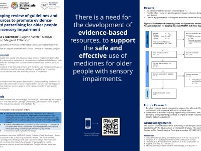 A Scoping Review of Guidelines and Resources to Promote Evidence-Based Prescribing for Older People with Sensory Impairment (OPwSI) BC Morrison1; E Asante2; MR Lennon2; MC Watson1 1. Strathclyde Institute of Pharmacy and Biomedical Sciences, University of Strathclyde, Glasgow; 2. Department of Computer and Information Sciences, University of Strathclyde, Glasgow Introduction By 2030, hearing impairment is expected to affect one in four people globally (WHO, 2022) and one in five in the UK (Hearing Link, 2023). Visual impairment is projected to impact 2.7 million people in the UK by 2030 (ONS
