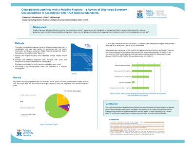 Background Fragility fractures, defined as fractures resulting from low energy trauma (1), are consistent with a diagnosis of osteoporosis. When a patient is discharged from hospital, guidelines recommend principal and additional diagnoses, relevant co-morbidities contributing to primary diagnosis, medications and relevant investigations are recorded (2). Methods This audit reviewed discharge summaries of all patients discharged from a rehabilitation unit over two months, in accordance with the Health Information and Quality Authority’s (HIQA) National Standard for Patient Discharge Summary
