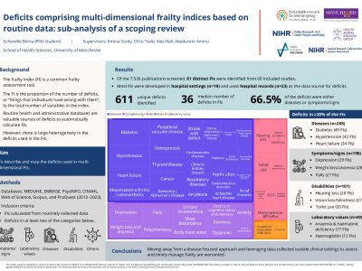 Introduction The frailty index (FI) is a frailty assessment tool calculated as the proportion of the number of deficits, or “things that individuals have wrong with them”, to the total number of variables in the index. Routine health and administrative databases are valuable sources of deficits to automatically calculate FIs. There is large heterogeneity in the deficits used in FIs. This sub-analysis of a scoping review on routine data-based FIs aimed to describe and map the deficits used in multi-dimensional FIs. Methods Seven databases were searched to find literature published between 2013
