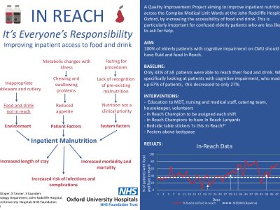 Background: ‘IN REACH’ was established, having identified a significant need to improve nutrition for cognitively and physically frail hospital inpatients, admitted to the Complex Medical Units (CMU) at the John Radcliffe Hospital. The IN REACH team includes the CMU multi-disciplinary team (MDT), representatives from patient and volunteer groups, caterers and medical illustrators. Introduction: IN REACH identified that food and drink is often unreachable by inpatients. The project’s aim is to ensure food and drink is always within patient reach, improving nutritional intake, avoiding