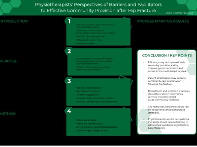 Purpose To investigate physiotherapists’ perspectives of effective community provision following hip fracture. Methods Qualitative semi-structured interviews were conducted with 17 community physiotherapists across England. Thematic analysis drawing on the Theoretical Domains Framework identified barriers and facilitators to implementation of effective provision. Interviews were complemented by process mapping community provision in one London borough, to identify points of care where suggested interventions are in place and/or could be implemented. Results Four themes were identified