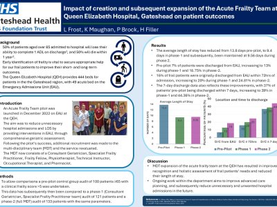 Introduction An Acute Frailty Team pilot was launched in December 2022 at the QEH. The aim was to reduce unnecessary hospital admissions and length of stay (LOS) by providing interventions in the Emergency Admissions Unit (EAU), through comprehensive geriatric assessment. Following the pilot’s success additional recruitment was made to the multi-disciplinary team (MDT) and the service revaluated. The MDT consists of a Consultant Geriatrician, Specialist Frailty Practitioner, Frailty Fellow, Physiotherapist, Technical Instructor, Occupational Therapist, and Pharmacist. Method To allow