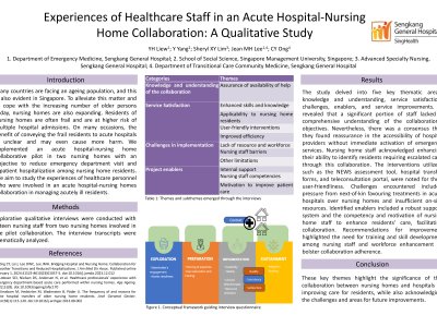 Introduction: Many countries are facing an ageing population, and this is also evident in Singapore. To alleviate this matter and to cope with the increasing number of older persons today, nursing homes are also expanding. Residents of nursing homes are often frail and are at higher risk of multiple hospital admissions. On many occasions, the benefit of conveying the frail residents to acute hospitals is unclear and may even cause more harm. We implemented an acute hospital-nursing home collaborative pilot in two nursing homes with an objective to reduce emergency department visit and