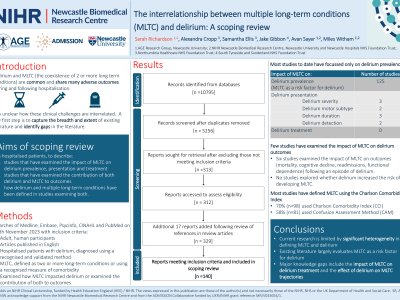 Introduction Delirium and multiple long-term conditions (MLTC) share numerous risk factors and have been shown individually to be associated with adverse outcomes following hospitalisation. However, the extent to which these common ageing syndromes have been studied together is unknown. This scoping review aims to summarise our knowledge to date on the interrelationship between MLTC and delirium. Methods Searches including terms for delirium and MLTC in adult human participants were performed in PubMed, EMBASE, Medline, Psycinfo and CINAHL. Descriptive analysis was used to summarise findings