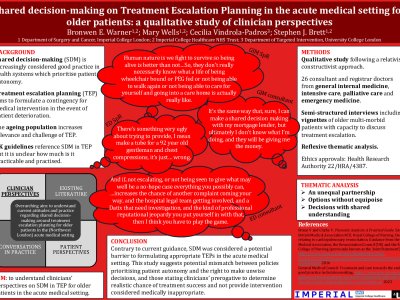 Introduction Shared Decision-Making (SDM) is increasingly expected in most aspects of UK medical practice and can be particularly important for older patients to guide goals of care. Treatment Escalation Plans (TEP) summarise medical intervention to be attempted in the event of acute deterioration. Current guidance advocates SDM in TEP but it is unclear whether this is considered practicable by clinicians. This study aims to understand clinicians’ perspectives on SDM in TEP for older patients in the acute medical setting. Methods This was a qualitative study following a relativist
