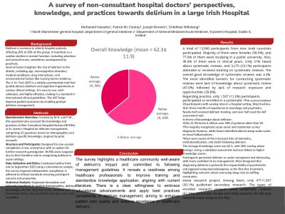 Background: Delirium is a common condition in hospitals, especially among older people. This refers to a dramatic decline in mental capabilities marked by diminished concentration and consciousness. Aims: The purpose of this study is to assess the views, knowledge, and behavior of non-consultant hospital doctors about managing delirium in a large Irish hospital. Methods: Questionnaires were given to 28 healthcare professionals from various departments according to Davis and MacLullicin (2009). It was conducted between July and September 2023 with emphasis on finding out its prevalence rate