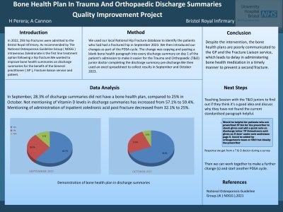 Introduction In 2022, 293 hip fractures had been admitted to the Bristol Royal Infirmary. As recommended by National Osteoporosis Guideline Group ( NOGG ) intravenous zoledronate is the first line treatment option following a hip fracture. Aims We wanted to improve bone health summaries on discharge summaries for the benefit of the General practitioner ( GP ), Fracture liaison service and patient. Results We used our local National Hip Fracture database to identify the patients who had had a fractured hip in September 2023. We then introduced our changes as part of the PDSA cycle. The change