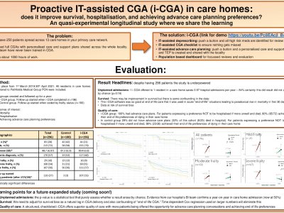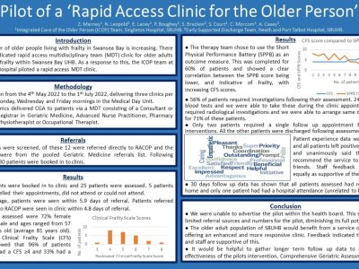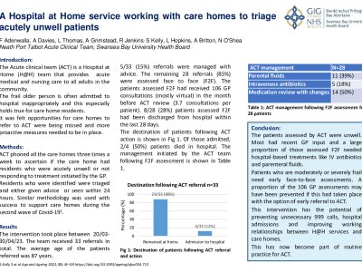 This poster demonstrates how a hospital at home team (the Acute Clinical Team (ACT), Neath Port Talbot) piloted an early intervention scheme, in care homes to prevent admission to hospital. Instead of waiting for care homes to contact the service when residents became unwell, during the second wave of COVID 19, the ACT proactively rang care homes three times weekly to seek out the acutely unwell patients and provide acute medical and nursing care quickly and efficiently. With GP's unable to visit the care residents at the rate required and avoidable hospital admissions rising, the pilot sought