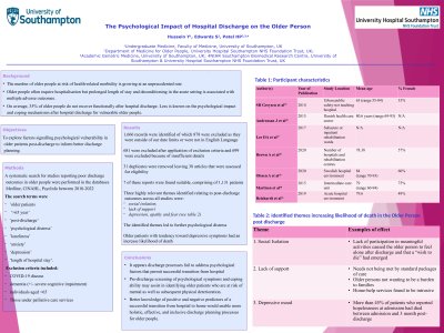 The Psychological Impact of Hospital Discharge on the Older Person Hussein Y 1, Edwards S 2, Patel HP 2,3,4 1 Undergraduate Medicine, Faculty of Medicine, University of Southampton, UK; 2 Department of Medicine for Older People, University Hospital Southampton NHS Foundation Trust, UK; 3Academic Geriatric Medicine, University of Southampton, UK; 4NIHR Southampton Biomedical Research Centre, University of Southampton & University Hospital Southampton NHS Foundation Trust, UK Background The number of older people at risk of health-related morbidity is growing at an unprecedented rate. Older