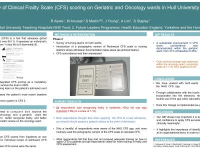 Introduction The Rockwood Clinical Frailty Scale (CFS) is a tool that assesses global frailty, validated for use in people aged over 65. It assesses an individual’s functional status to assign a number from 1 (very fit) to 9 (terminally ill). Hull University Teaching Hospitals has integrated mandatory CFS assessment on admission for inpatients aged over 65. This project aimed to improve the accuracy of CFS scoring in an oncology and a geriatric ward by empowering ward nurses to better recognise frailty. Methods Phase 1. Baseline data was collected from admission CFS scores from inpatients on