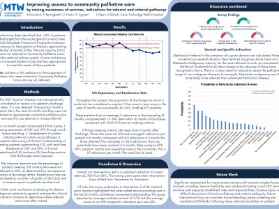 Introduction 40% of 1056 patients discharged from our acute geriatrics ward met Gold Standards Framework (GSF) Prognostic Indicator Guidance for Recognition of Patients approaching End of Life (EOL). 92% were not referred to Community Palliative Care (CPC) services, meaning patients’ needs were not fully met and other services over-stretched. This project aimed to achieve a 10% reduction in missed referrals. Methods Highlighting the missed referral rate enabled engagement of key stakeholders including ward and palliative care multidisciplinary teams. This 12-month project comprised four PDSA
